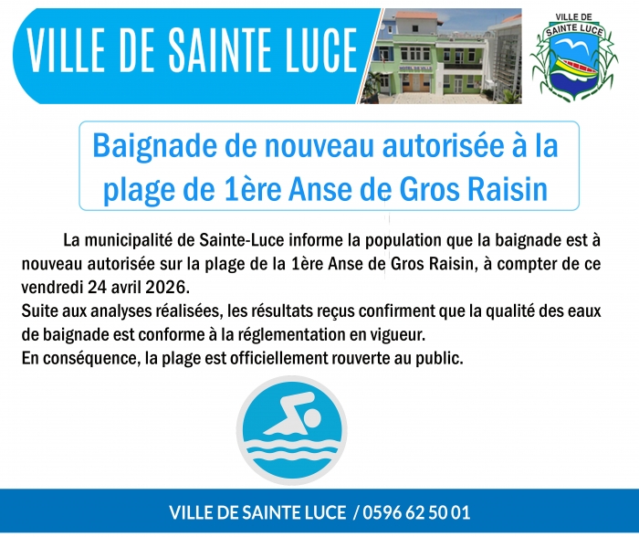 Baignade de nouveau autorisée à la 1ère Anse de Gros Raisin