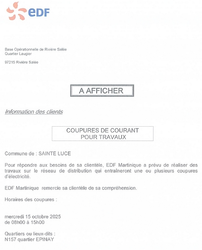 Le maire de ville de Sainte Luce, Nicaise MONROSE, informe la population et les riverains de la rue JULES FERRY, que des travaux d’enrobés se dà ...